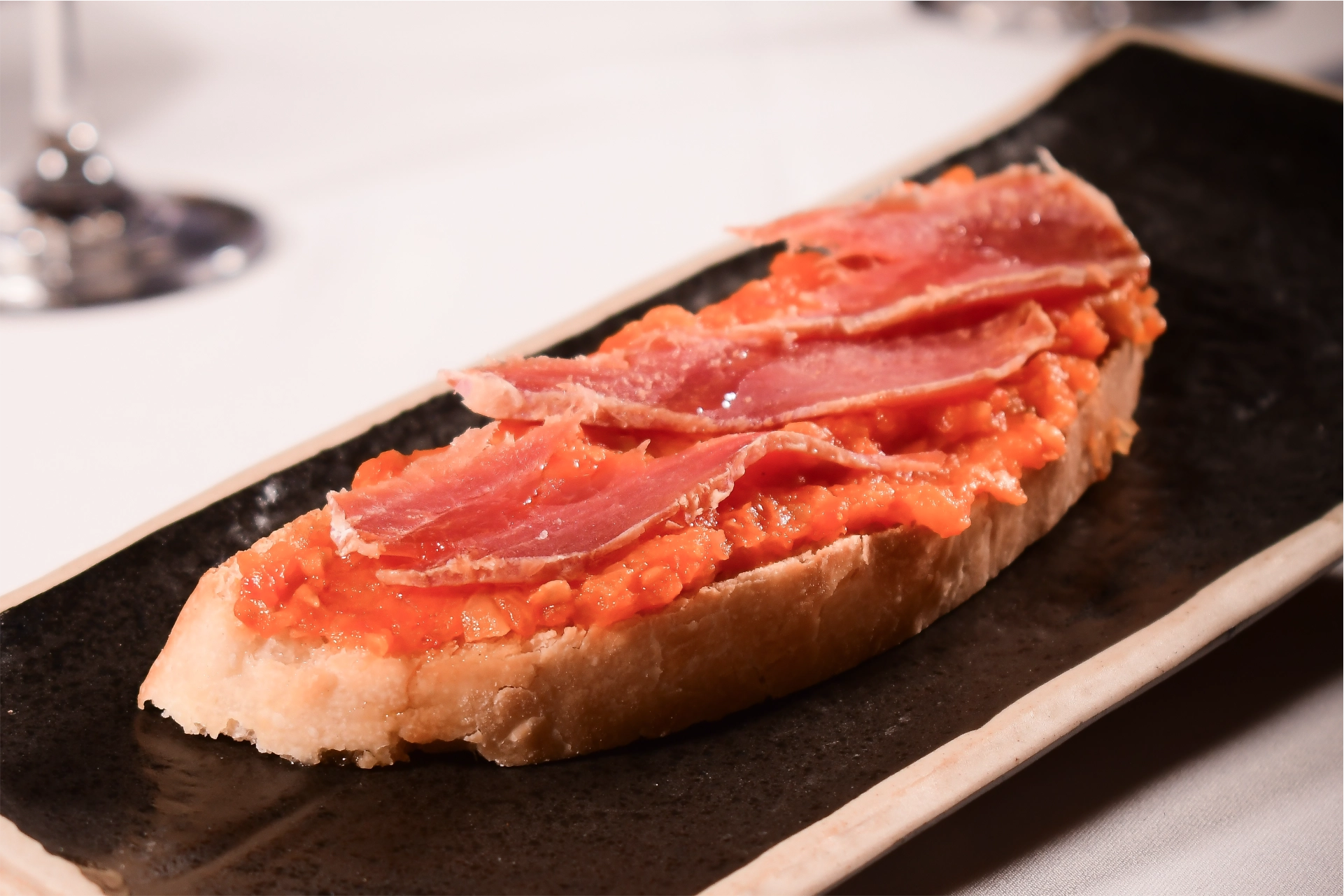 Pan rústico tostado, frotado con ajo, tomate maduro fresco, aceite de oliva y jamón ibérico.
