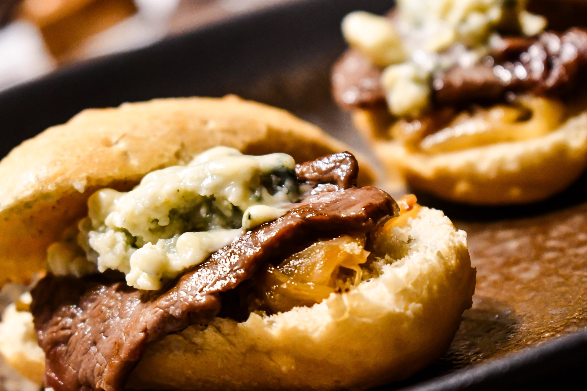Un exquisito montadito de solomito, con carne jugosa y perfectamente sellada, coronado con una capa de cebolla caramelizada que aporta dulzura y profundidad de sabor. Sobre esto, un toque de queso azul que añade intensidad y contraste, todo sobre un pan ligeramente tostado que equilibra las texturas.