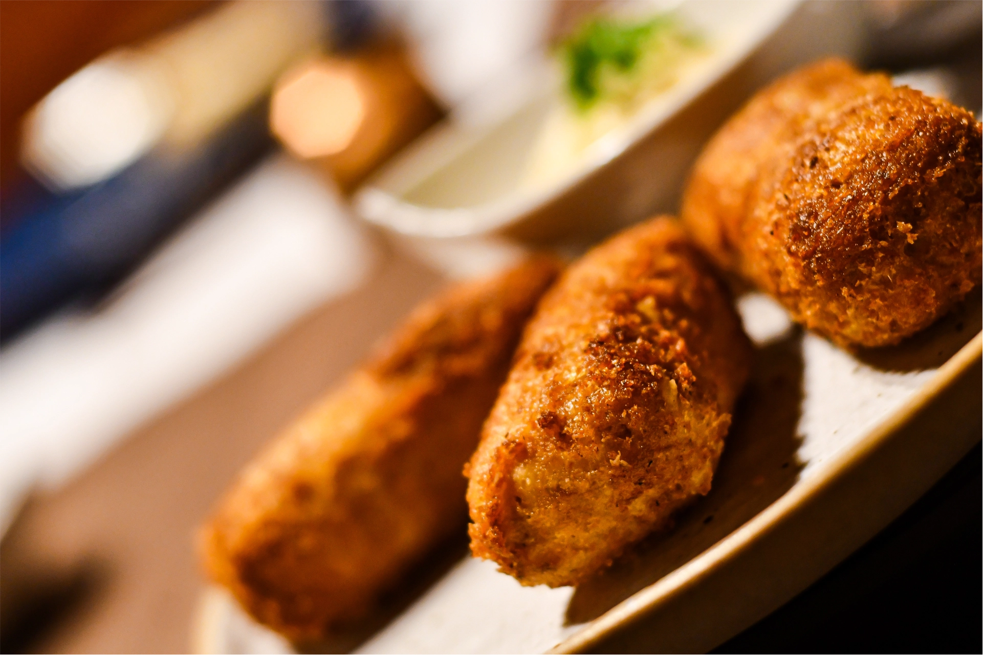 Unas irresistibles croquetas a la madrileña, con un relleno cremoso de orellana que se deshace en el paladar, envueltas en una capa dorada y crujiente. Acompañadas de un suave y aromático alioli, que realza cada bocado con su toque intenso. Una entrada seductora que conquista los sentidos.